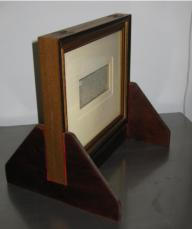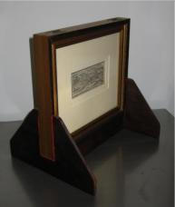 Bespoke frame and mount for double sided woodcut using ultra violet filtering glass.