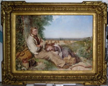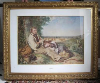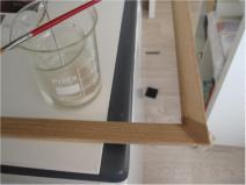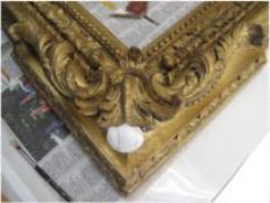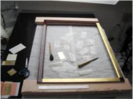 During frame refit, creating a new gold mount to enable the watercolour to fit